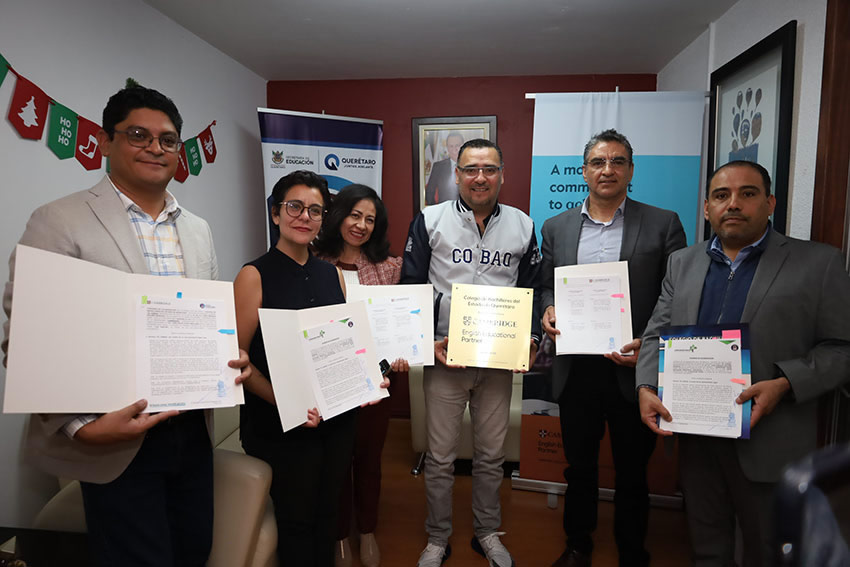 Con el propósito de fortalecer el aprendizaje del idioma inglés y ampliar las oportunidades académicas y laborales de la comunidad estudiantil, los titulares del Colegio de Bachilleres del Estado de Querétaro (COBAQ), León Enrique Bolaño Mendoza, y de Cambridge University Press & Assessment, Cruz Castro López, firmaron un acuerdo de colaboración que contempla el uso de materiales impresos y digitales, así como programas de capacitación docente, en el marco del Programa Institucional para el Fortalecimiento del Inglés.